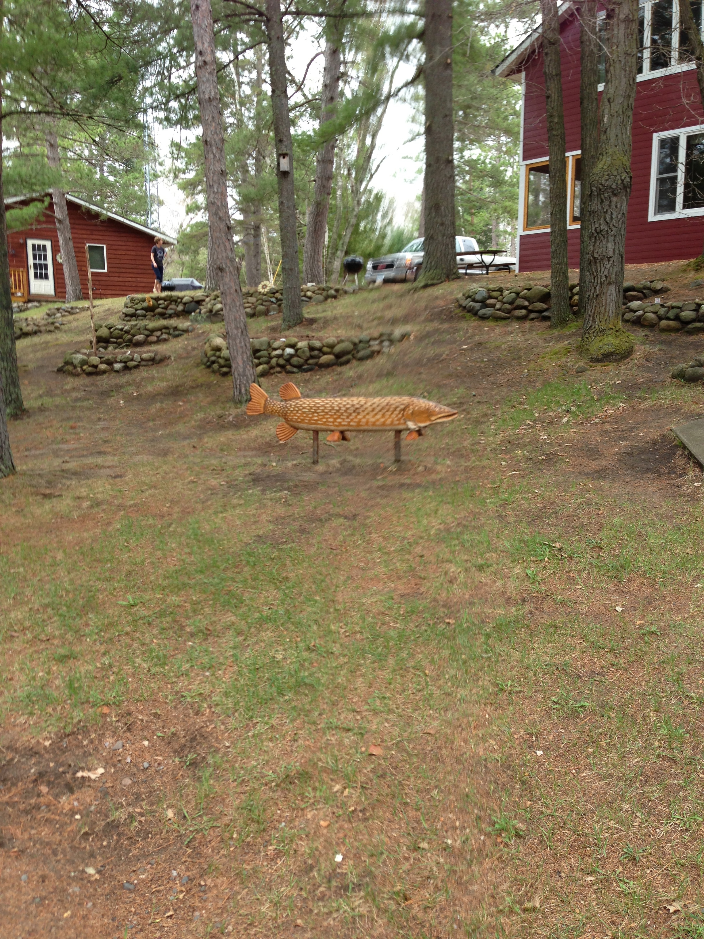 While sitting outside watching Al fish, I was bare foot (and a cold drink in my hand). It’s about 70 degrees and muggy with a gentle breeze. We can do 70 and muggy. We can even go as far as 85 with the muggy, so we’re doing quite nicely, thank you very much. Here’s a view of our cabin–Cabin 5– See the lefthand chair? I’m claiming it for the duration. Cabin 5 has two bedrooms, one bath, a kitchen/dining area and a comfy couch. It’s also got a really nice screened-in porch for bug season. Fortunately, we’re pre-bug season.