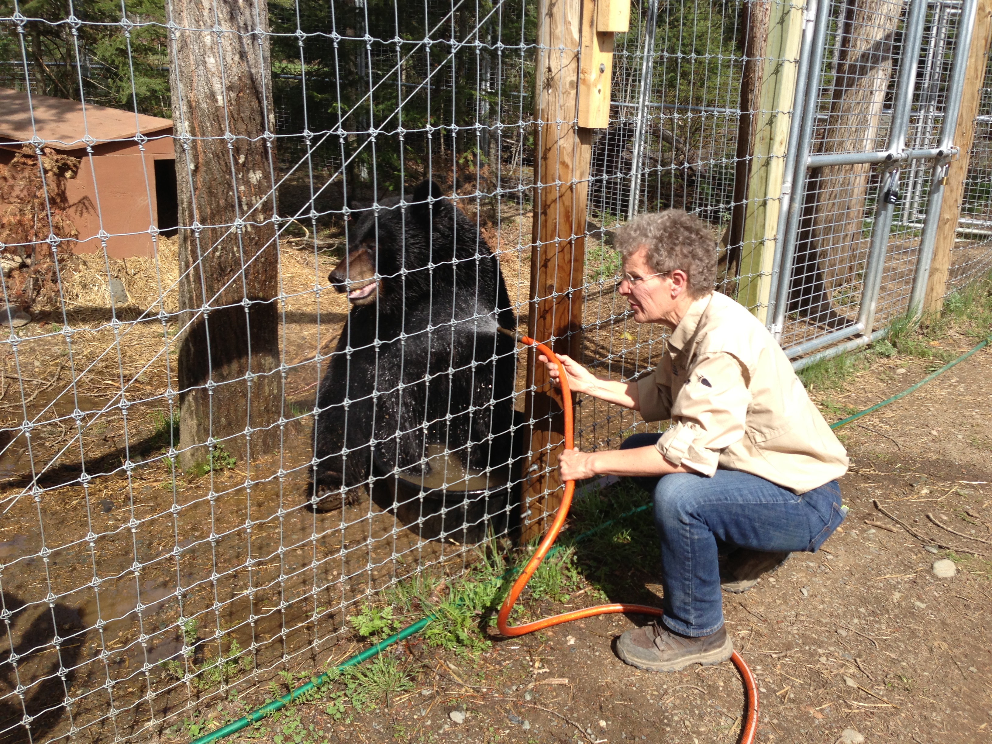 I learned so much about the wolves and the bears. We must have spent a couple of hours at both places. And I’m planning to visit their websites to keep learning. Fascinating. One thing that I learned is if you are non-threatening with a black bear and don’t try to take it’s food or it’s cubs, it pretty much leaves you alone. When it is scared, it will charge, but if you are brave enough (and I wouldn’t be) to remain calm, the charge will stop several feet away from you, and the bear will move on. The bear, above, was really sweet. He would “kiss” the woman’s hands by licking them because the bath was feeling so good. However, when it came to feeding time, there was one person who distracted the bear with treats and another who opened the cage and put the food inside. In other words, nobody took any chances with this gentleman. All three of the ambassador bears had been raised in captivity and would not do well in the wild.