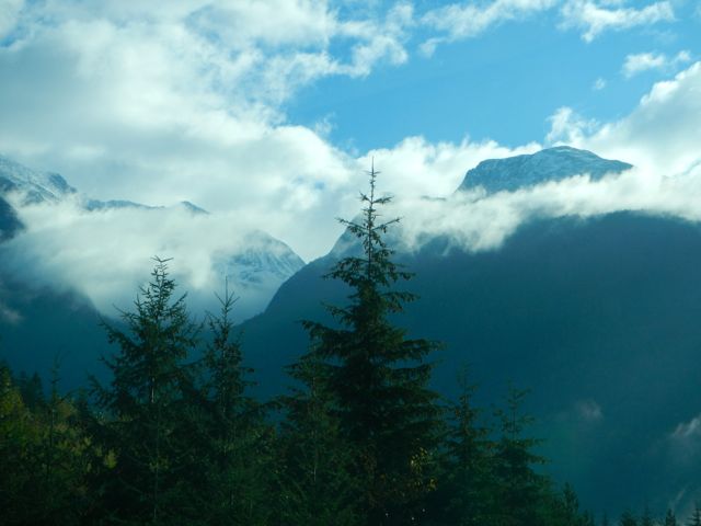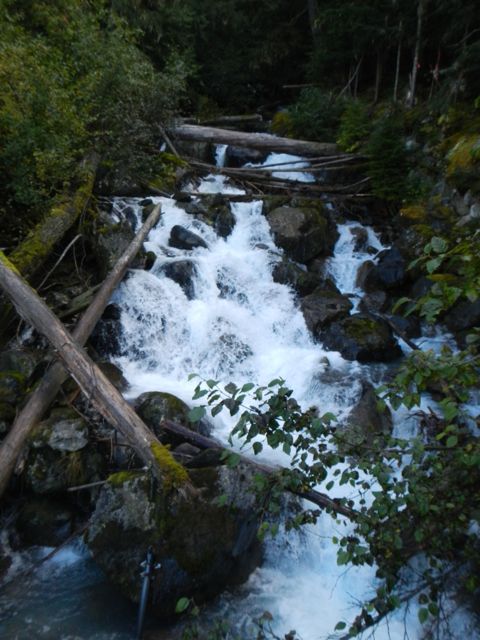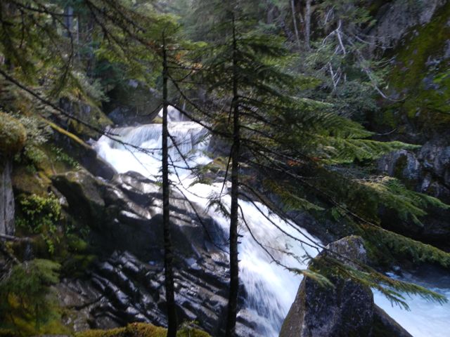 After Nairn, we drove back towards Whistler to Garibaldi Provential Park to hike up to Wedgemont Falls (971 ft.) The drive up to the parking place was lovely and very bumpy in our little rental. A couple of times, the ruts were so deep that we lost traction. I know. I happened to be driving.