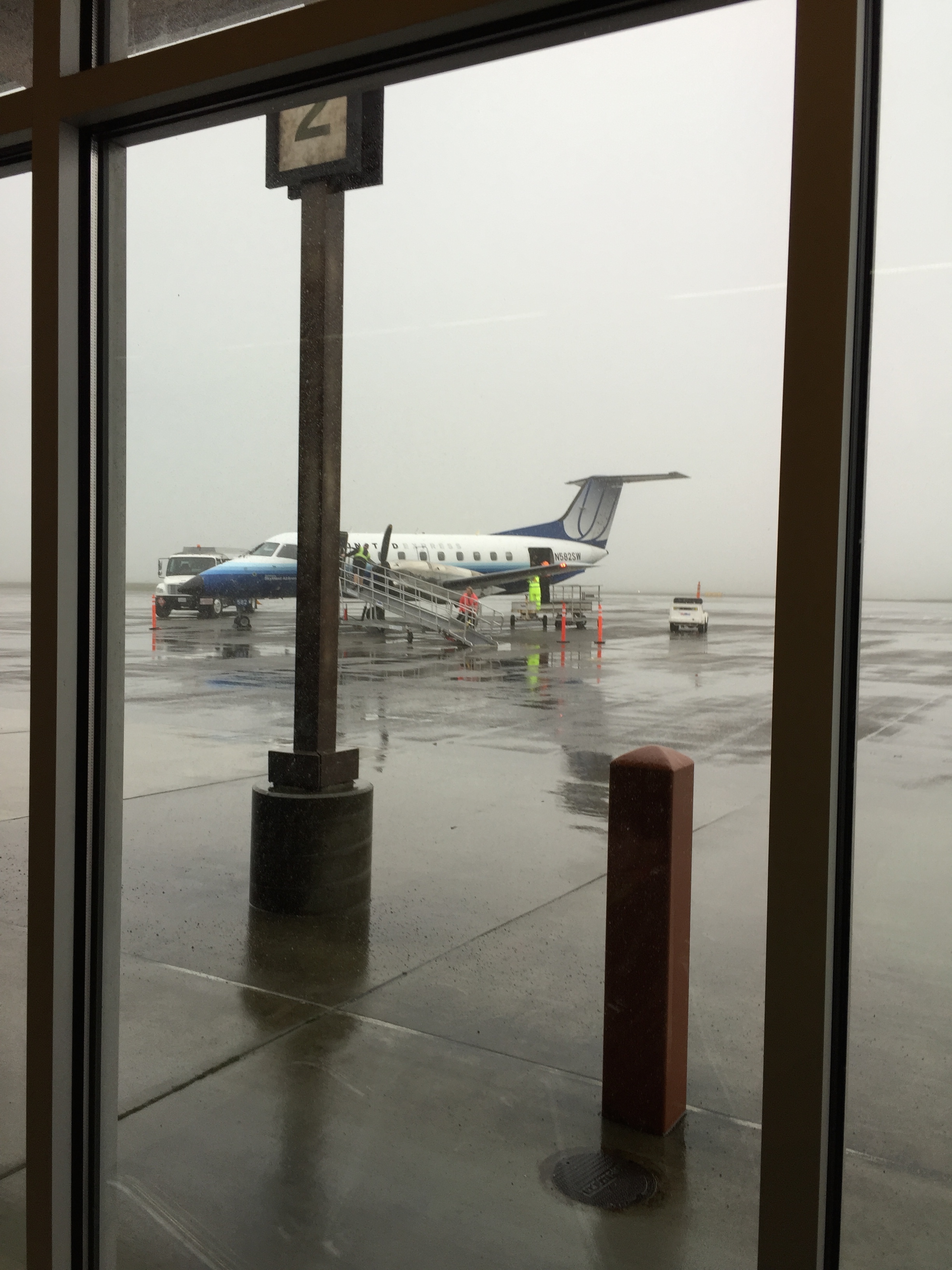 (Here’s a picture of my plane which landed in the fog after the second attempt. The flight personnel gave the pilot a high five. He deserved much more than that. Man’s got some skills, landing in fog like that.