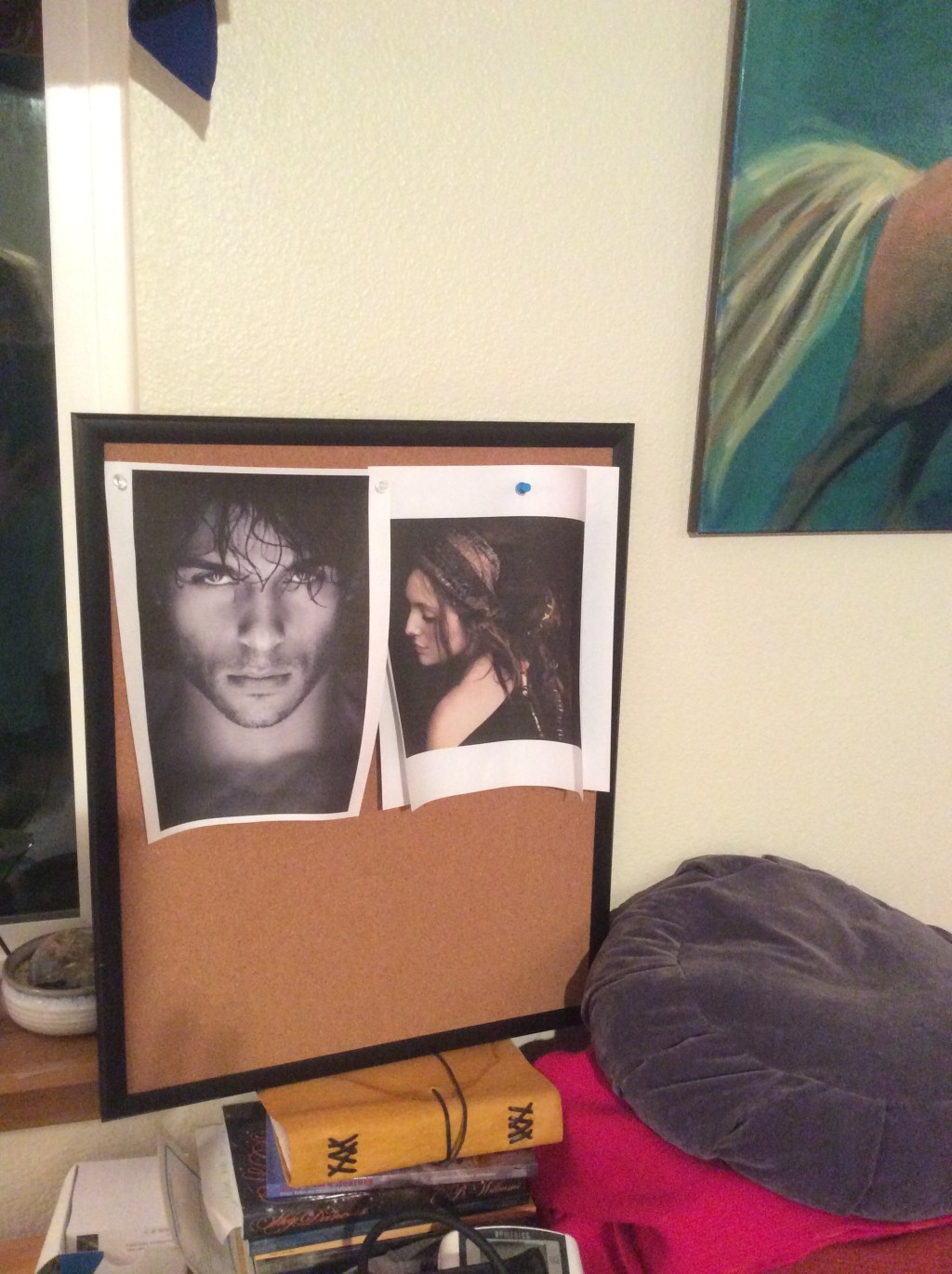 I leave you with a picture of my two main characters in Champion of Entean, Eloch and Wren….They’re on a bulletin board that’s propped on my writing table. (Check out Eloch…who doesn’t want to spend a few years with that guy?)