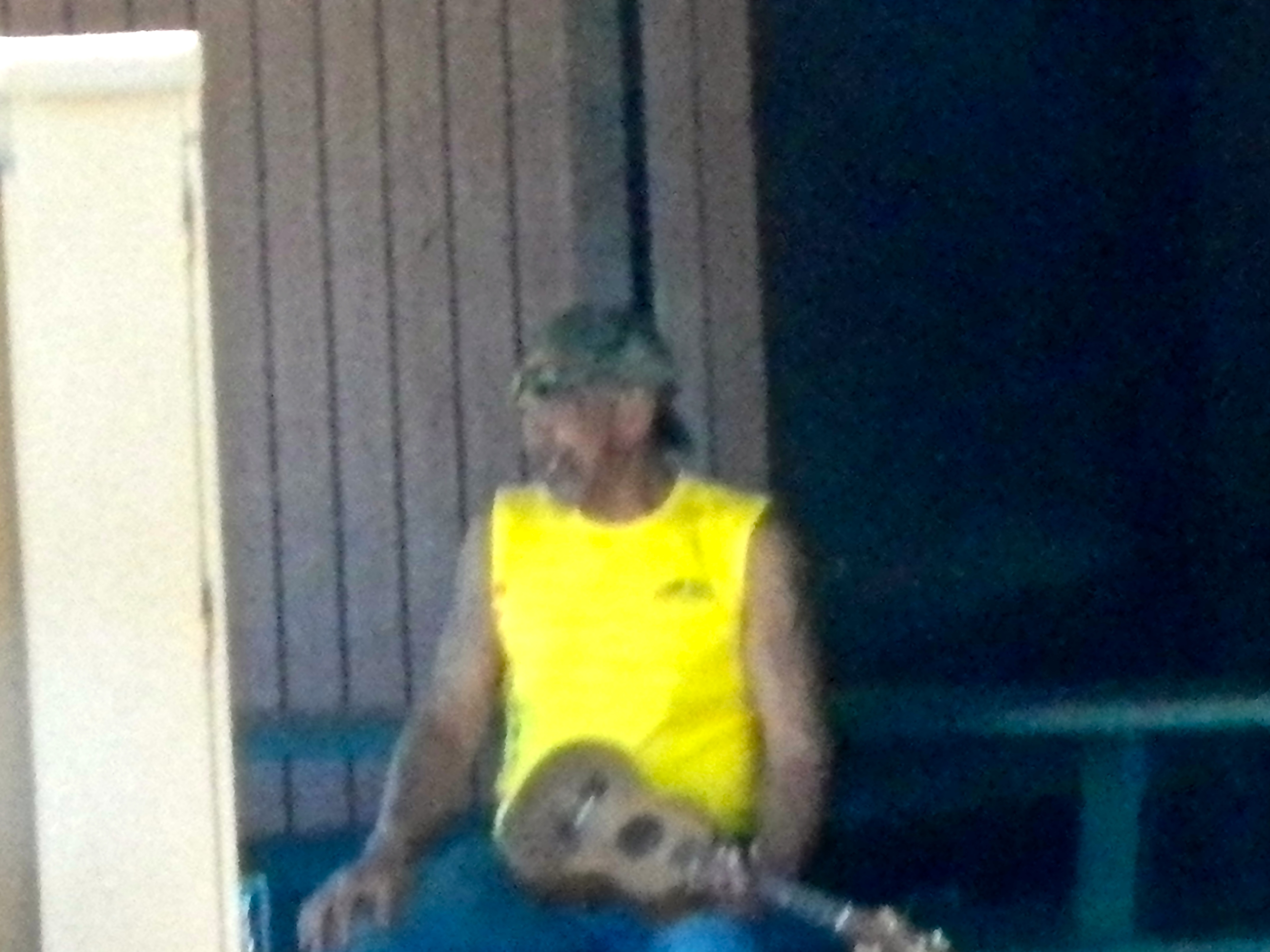 Later on, a man in a yellow shirt, a can of beer and a ukulele, settled down with a friend to drink, talk and strum. Took a stealth shot of yellow shirted man. He was enjoying the day.