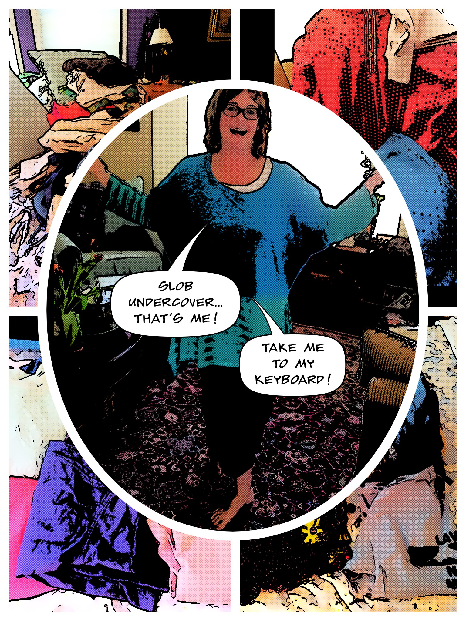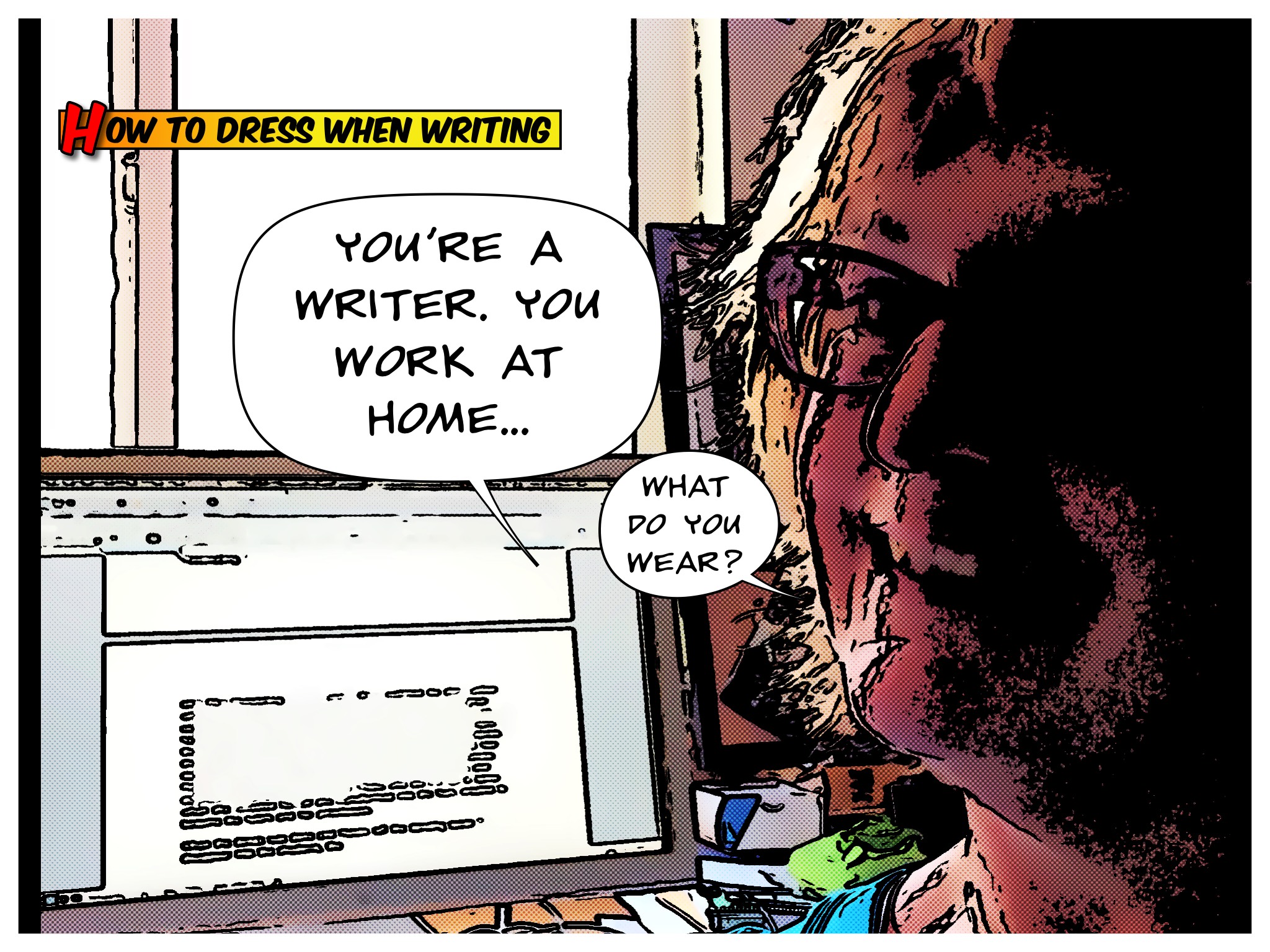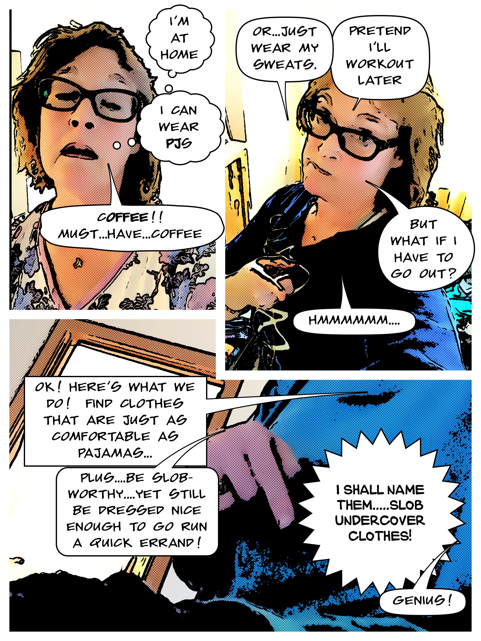 I leave you with a little comic strip about an author (me) trying to find the perfect clothes in which to write. I know. Deep….but if you want deep, you’re gonna have to wait until I’m more awake. It is important, though….you gotta be comfy and relaxed so the words can flow, but not so relaxed you look like a scuzzball if you have to leave your domain. (Scuzzball…that’d give you a lot of Scrabble points.)