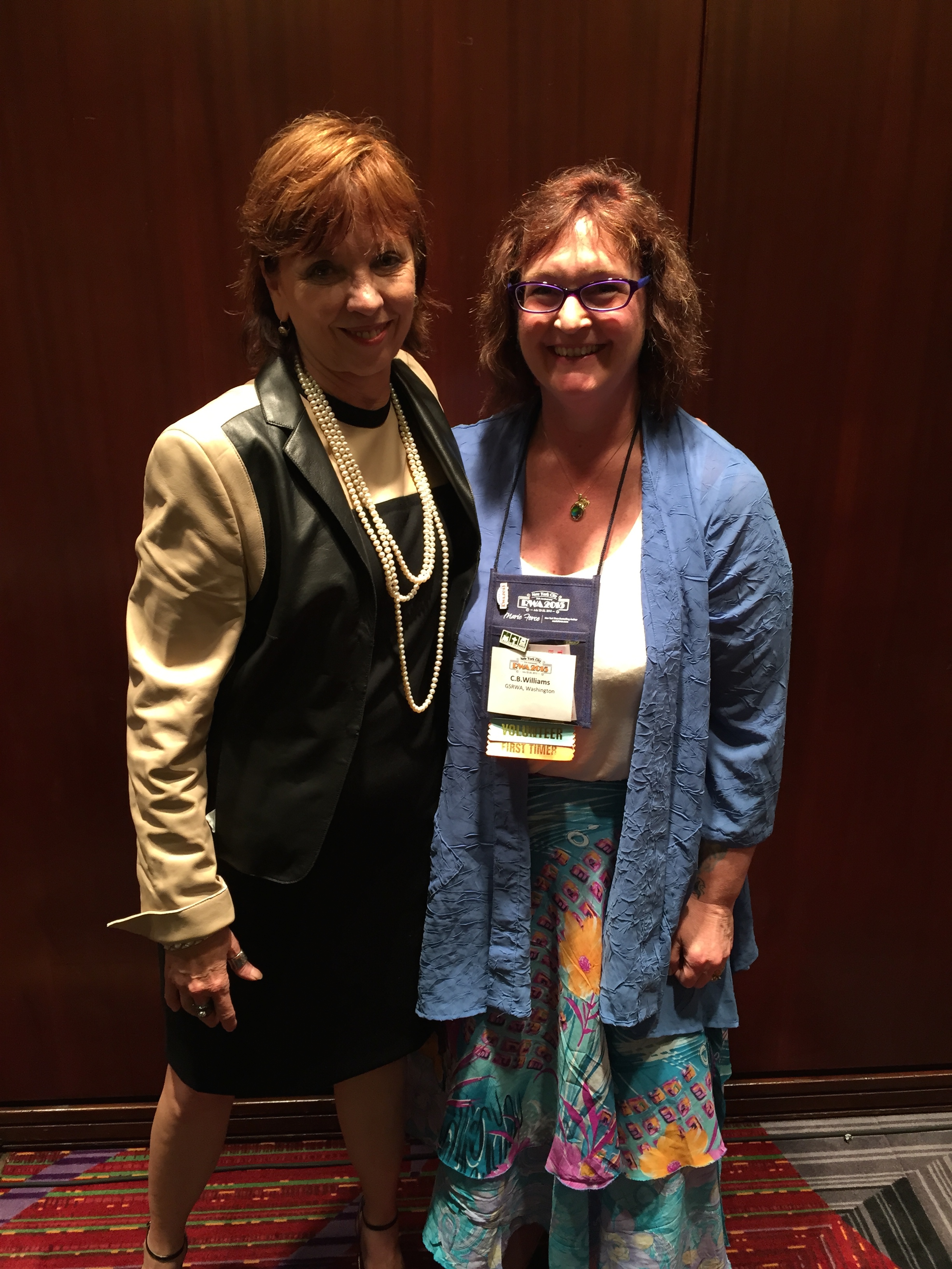 A First Timer. I’ve even a ribbon that says so. I was told it’s pretty overwhelming. And guess what? It is! I volunteered for a three-hour gig helping authors at the major book signing for the public. I had a long row of them to fetch and carry for. I loved it (my feet? notsomuch.) Got to meet some of my favorites like Joanna Bourne ,and met new ones like Alyssa Alexandria and Marina Adair. (I was assigned the As and Bs.)