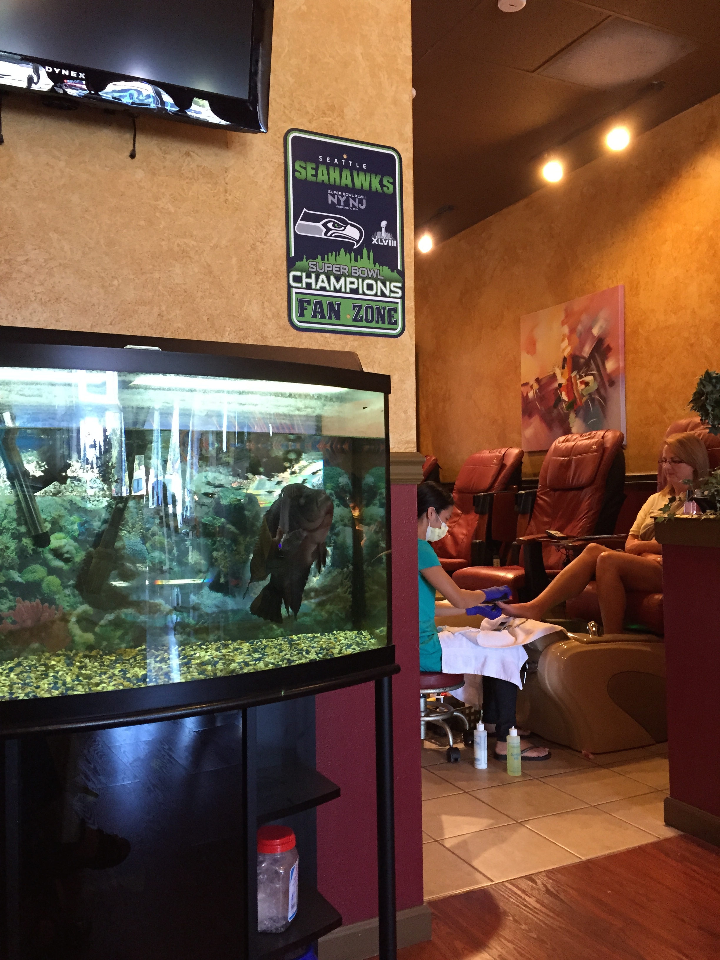 Okay, these PediChairs were amazing. I wanted to take one home. They’ve got a little foot bath in them with light therapy. I wonder if the Pharaohs had light therapy in their PediThrones. Obviously, they wouldn’t have chairs. They’d have thrones. PediThrones. I don’t even know it that’s a word. I don’t even know if PediChair is a word. It should be if it’s not.