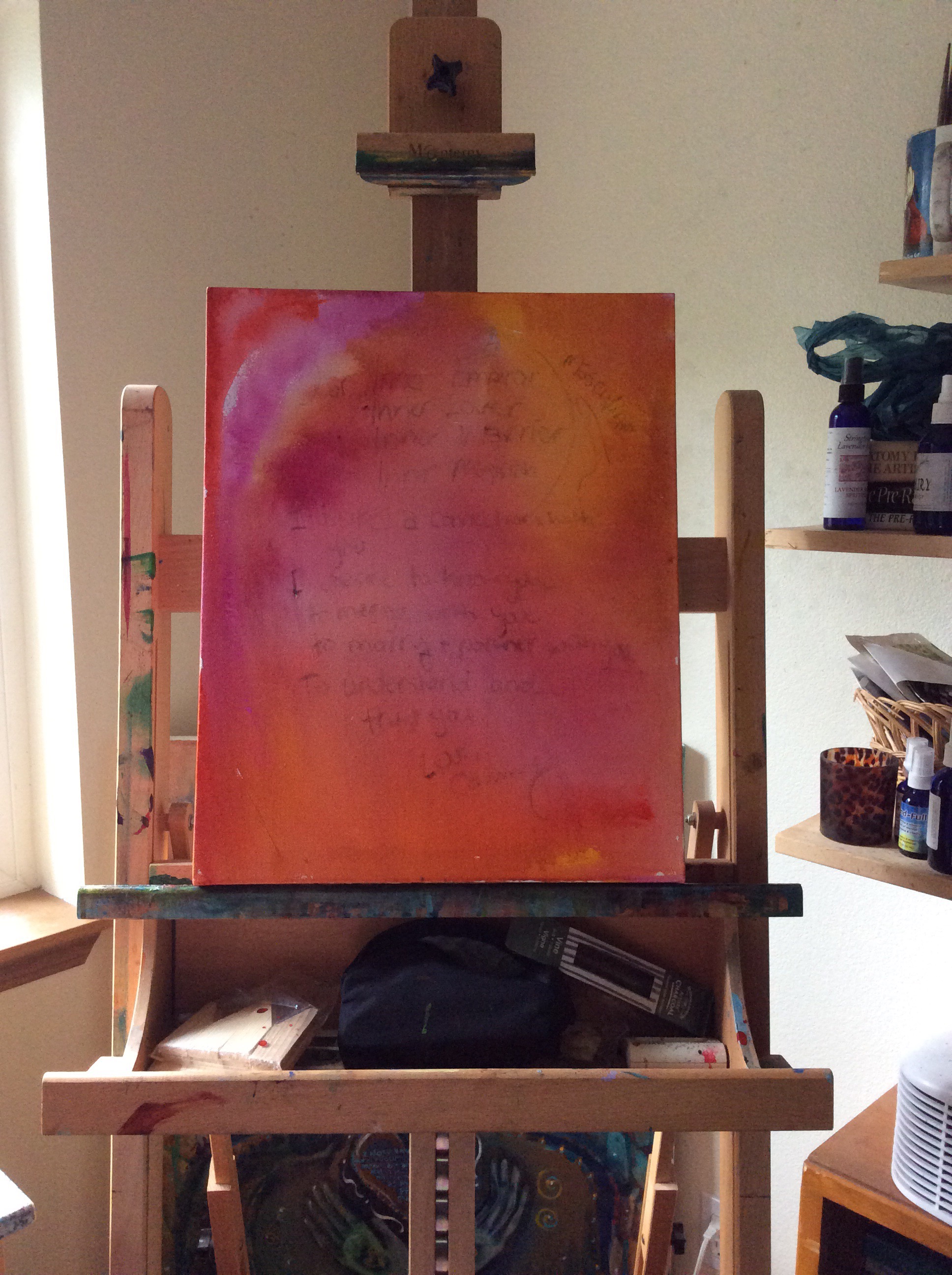 I leave you with the first step of the 13 step Color of Woman Process– writing your intention on the canvas and creating your portal which allows the image to emerge. It’s the beginning of an inner dialogue in living color, where a painting becomes a journey of self-discovery.