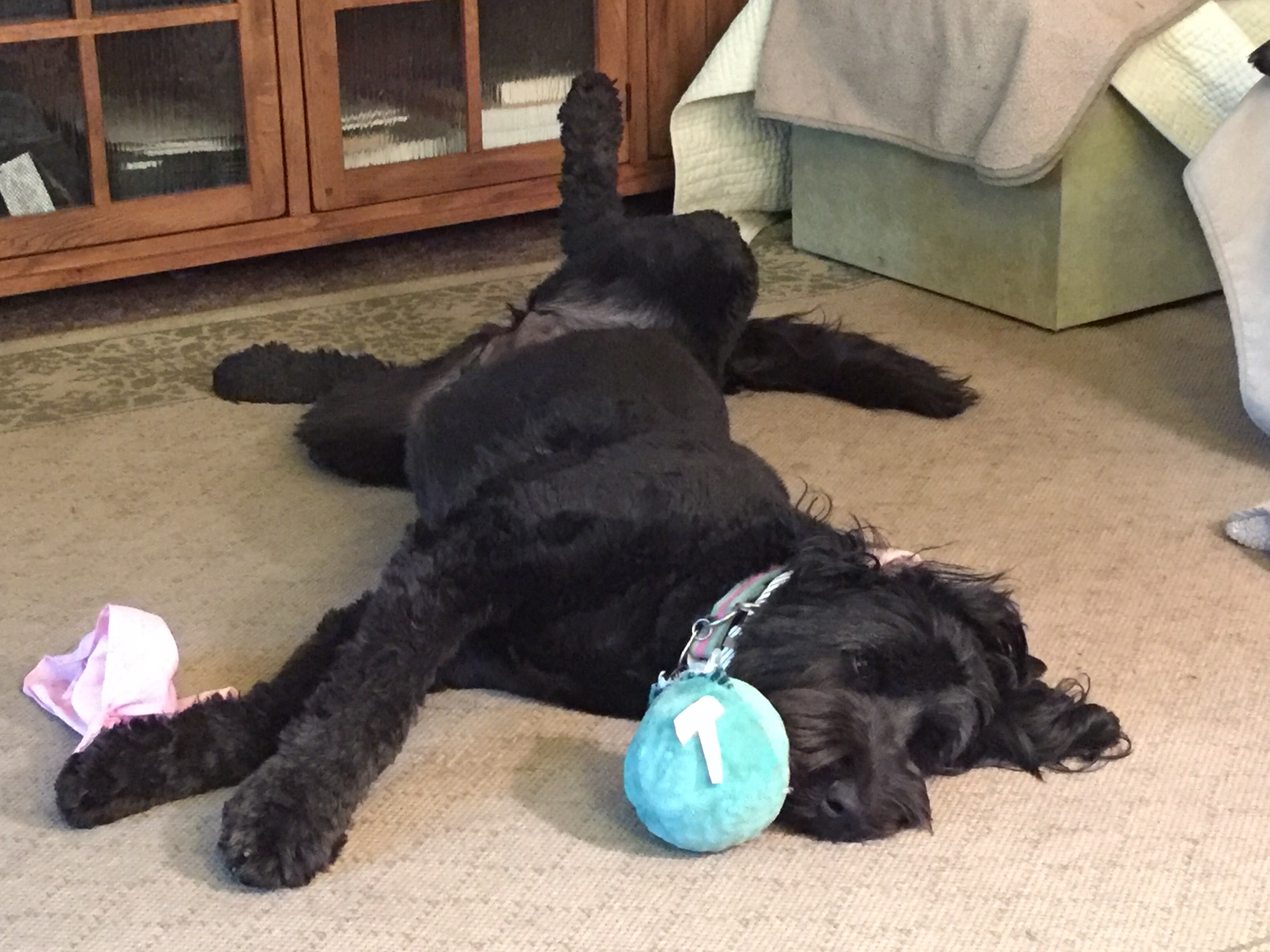 I leave you now with a picture of a dog and her ball. I have no idea why doodles love to chill this way, it’s certainly not ladylike, but it’s something that they all seem to do.