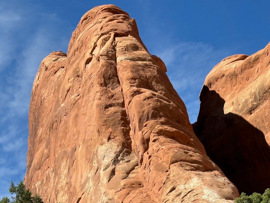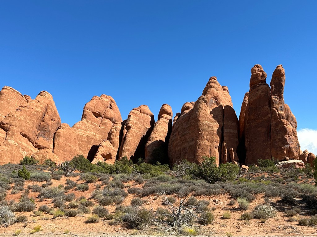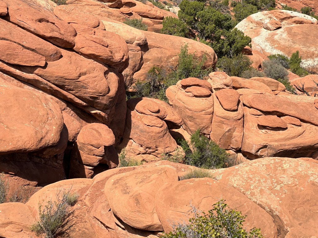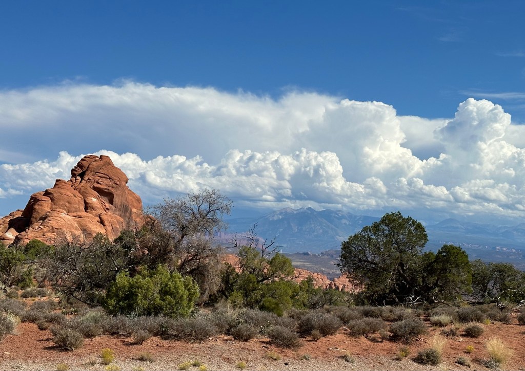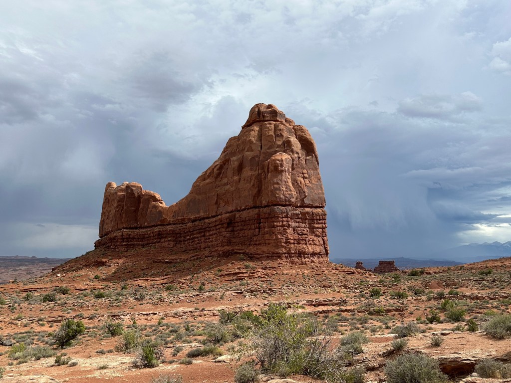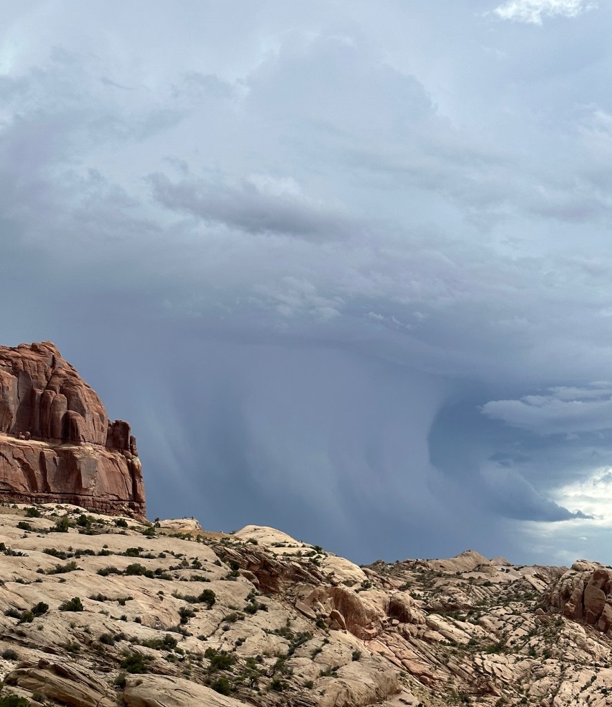 Yesterday was a wonderful day at Arches National Park. The weather was dramatic ranging from a thunderstorm to sunshine and the light brought out all the colors…dark blues, muted purples, greens, greys, and the beautiful rust read rocks. I am looking forward to capturing some of these colors at the easel when I get home. There was one color, it was a bright green…like the sea green Crayola Crayon…that was so beautiful contrasting with the red stone and the dark skys. The color actually was a layer of rock formed back in the Jurassic period when the area was covered in tropical swampyness.
