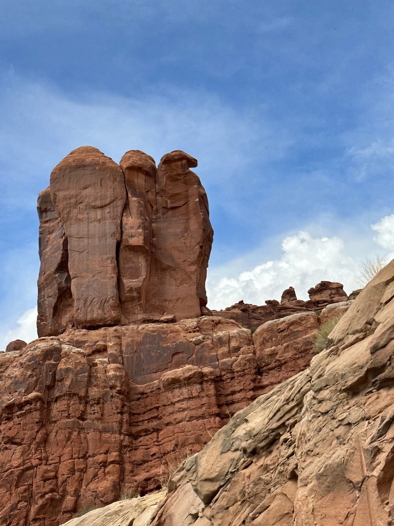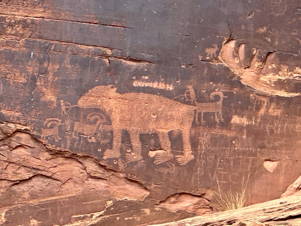 Four miles out of town along Potash Road is a wall of rock with hundreds of petroglyphs. The more you looked, the more you see. Easy to find where to pull over as it is marked and no hiking is necessary. Just lots of looking.